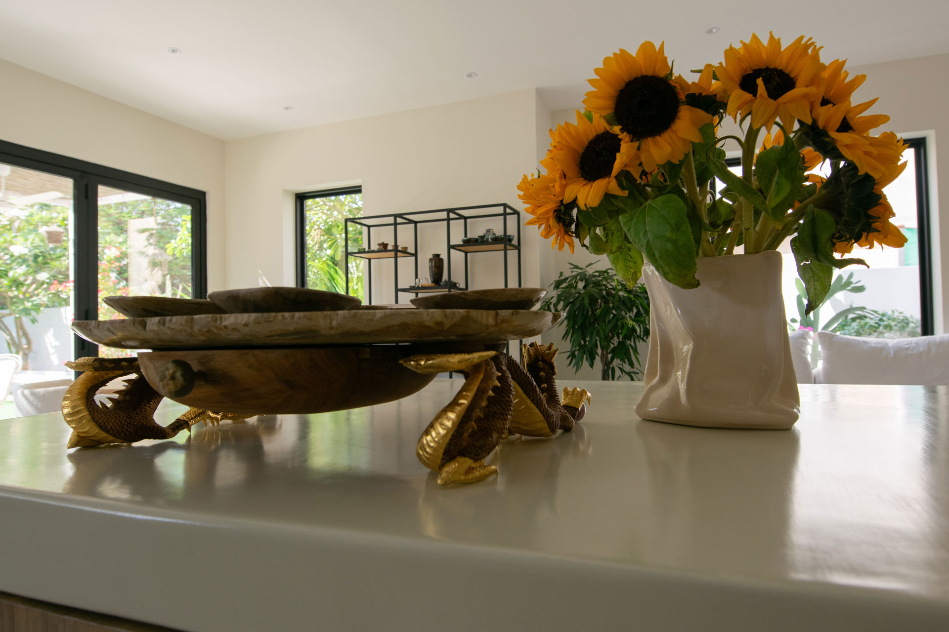 A modern kitchen with an elegant design, combining natural materials and a minimalist style. The spacious room is filled with natural light thanks to a large window, creating a cozy and warm atmosphere. The use of wooden facades and light shades gives the kitchen a harmonious and balanced look. Accent elements, such as a bouquet of sunflowers and decorative details, highlight the individuality of the interior, making the space not only functional but also inspiring.